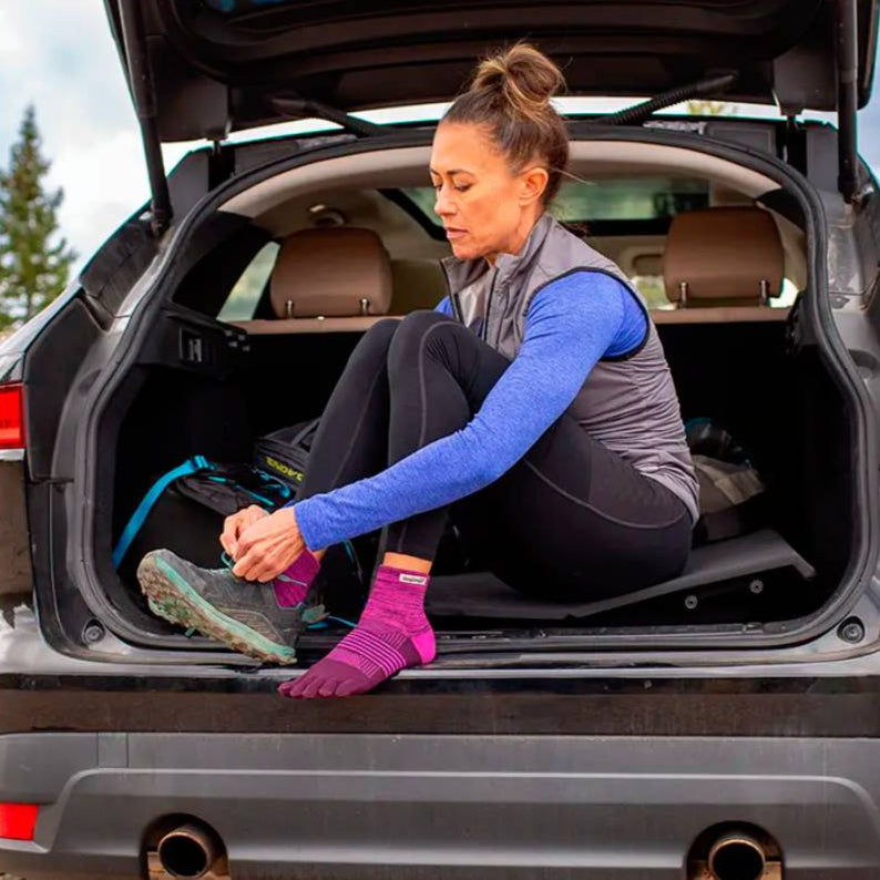Diseñados para mujeres que corren por terrenos irregulares, los calcetines Injinji Trail Midweight Mini-Crew Mujer con diseño de 5 dedos, ofrecen comodidad, protección y soporte. Su doble puño en altura Mini-Crew evita la entrada de suciedad y residuos, mientras que las fibras COOLMAX® EcoMade absorben la humedad. La amortiguación de peso medio en la planta y el soporte del arco garantizan comodidad en las carreras por montaña, mientras que el diseño único de cinco dedos minimiza las ampollas y permite un uso total del pie en senderos estrechos. Haz de este tu calcetín de confianza para entrenamientos, caminatas de un día y desafíos de ultra resistencia.