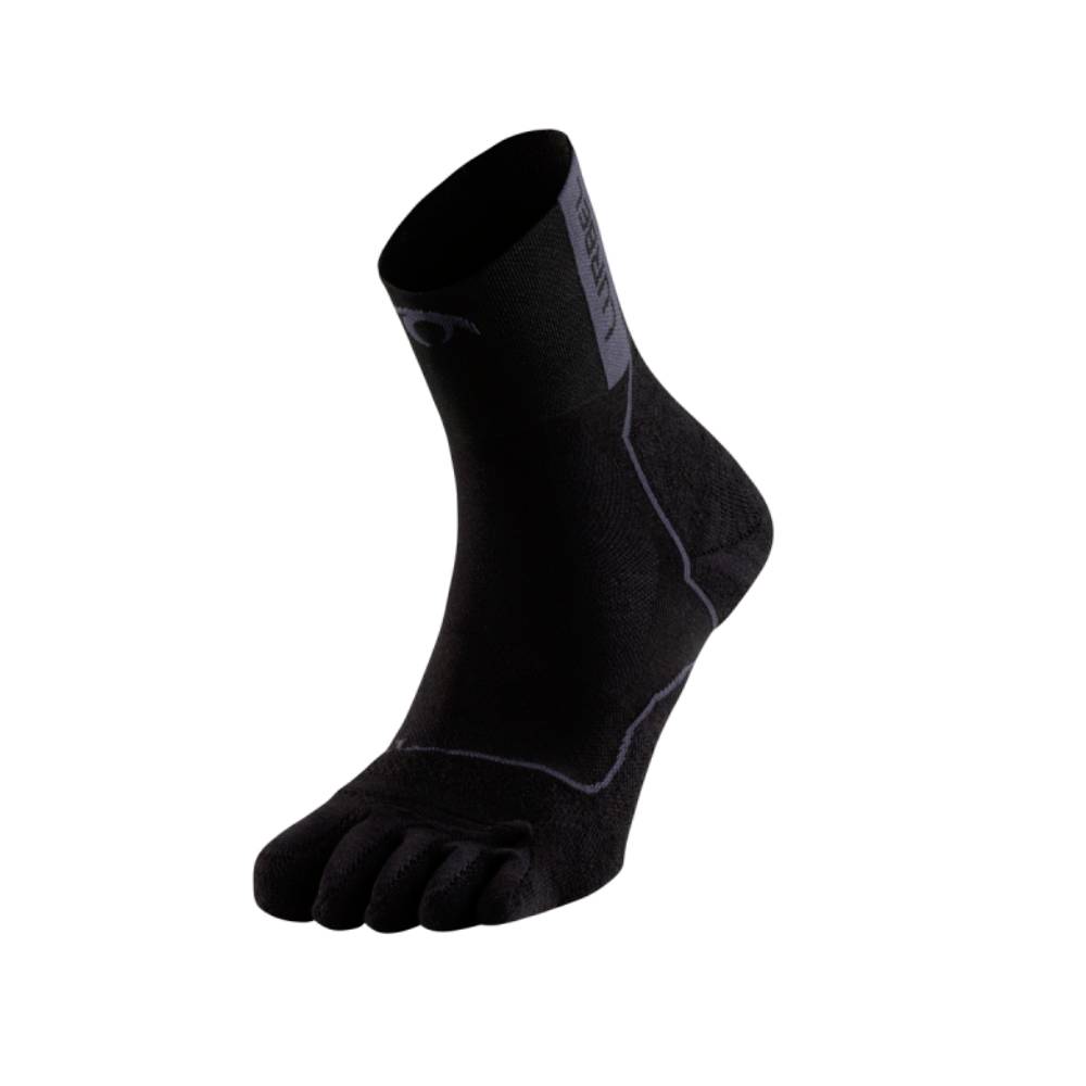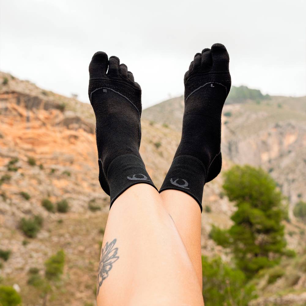 Calcetines con dedos para trail running de media distancia. Su estructura individualizada ofrece un movimiento natural de cada dedo, mejora la estabilidad y evita el roce entre ellos, reduciendo la aparición de ampollas incluso en las rutas más exigentes.
