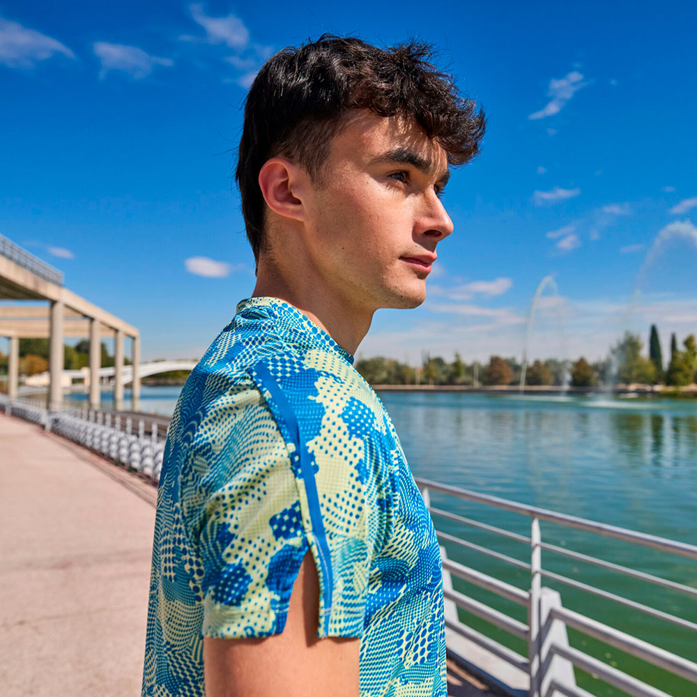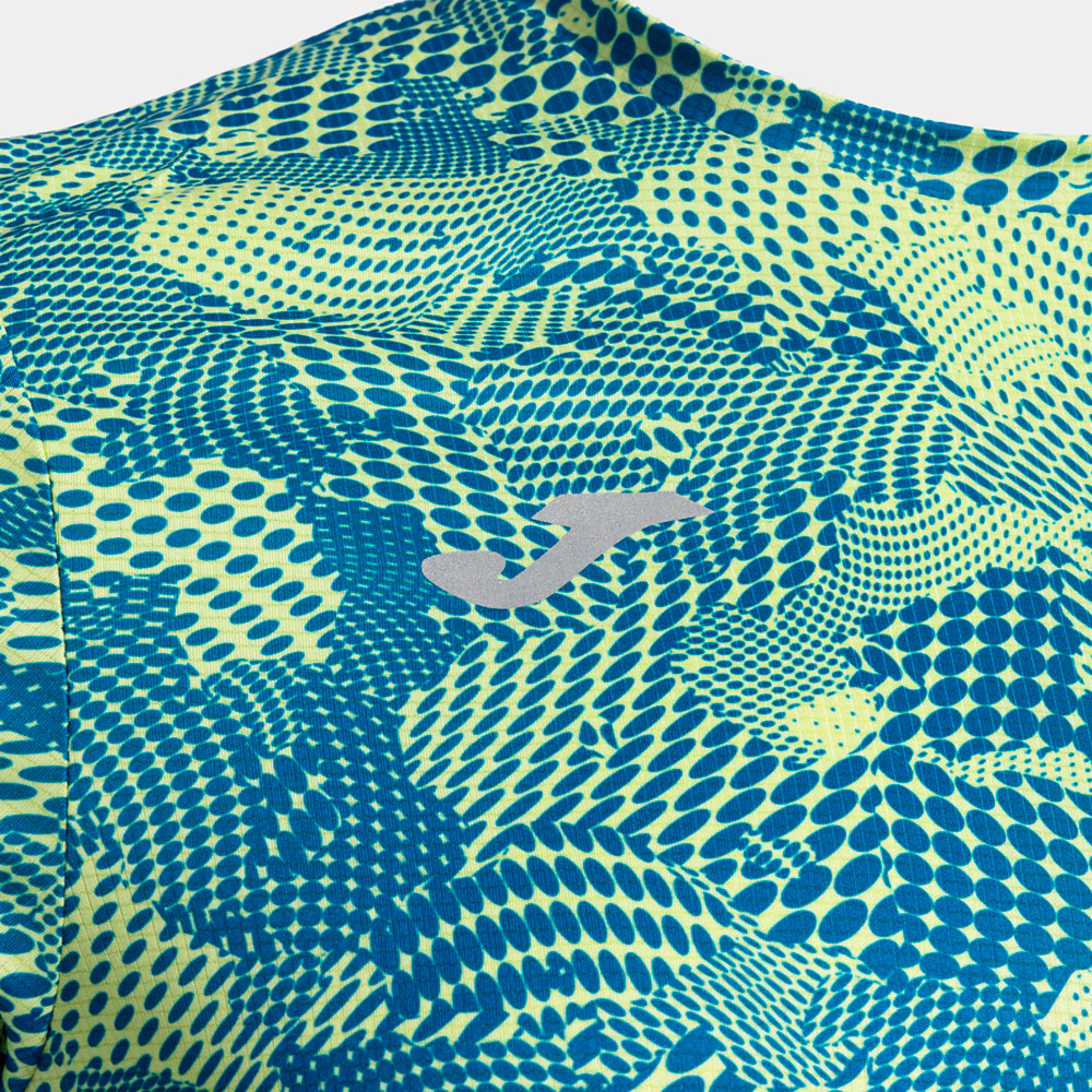 Está confeccionada en tejido súper ligero y transpirable gracias a la tecnología MICRO-MESH SYSTEM, que ayuda a evacuar el sudor y a regular la temperatura corporal al correr. Destaca el estampado multicolor que cubre toda la prenda y la llena de viveza.