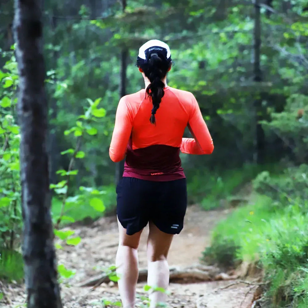 El corte Active Fit Women se adapta a la anatomía femenina sin apretar, favoreciendo el confort durante el esfuerzo. Las mangas largas aportan una protección extra frente a ramas, viento o exposición al sol, sin añadir peso innecesario. También destaca la ausencia de costuras en los hombros, un detalle pensado para evitar roces si se corre con mochila o chaleco.