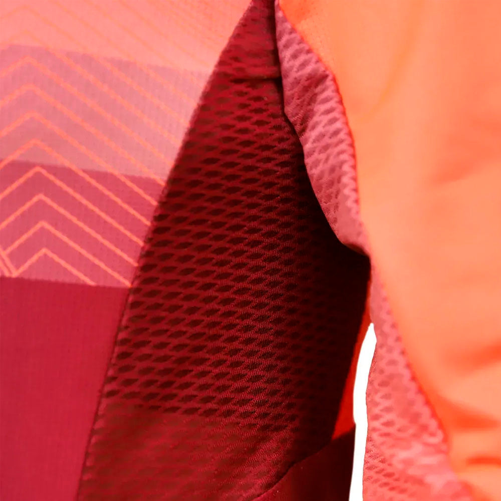 La zona de la espalda y las axilas incorpora tejido de rejilla 100% poliéster (100 g/m²), estratégicamente colocado para mejorar la transpirabilidad y ofrecer mayor confort al usar mochila de hidratación.