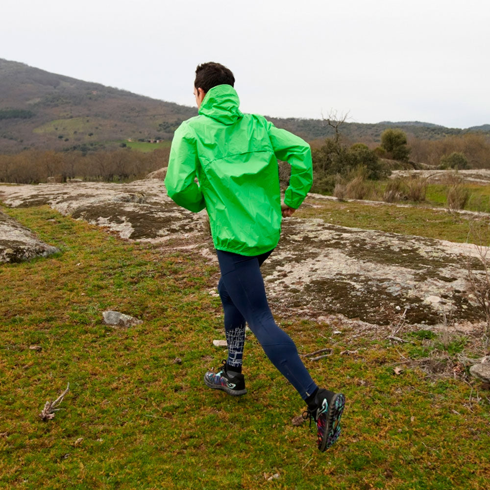 Incorpora cierre de cremallera completa, tirador y pieza protectora que previene las rozaduras en la piel. La solapa interior limita las filtraciones de agua y frío. La capucha cuenta con elástico que se adapta a la cabeza del runner para evitar deslizamientos. Además, tiene visera para mayor cobertura y protección. En los puños y el bajo, incluye banda elástica con el fin de conseguir un mejor aislamiento contra la lluvia y el frío.