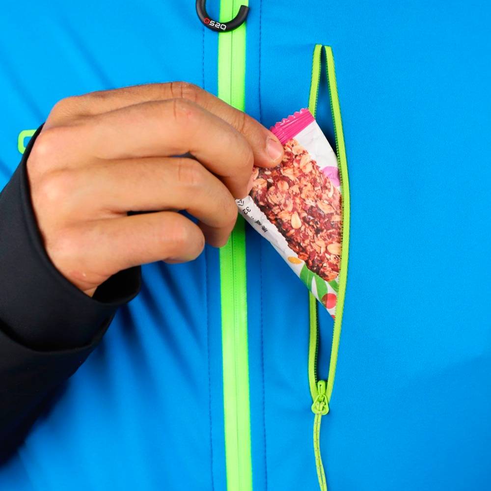 • Bolsillo en el pecho más amplio, con tirador largo compatible con guantes, ideal para guardar el móvil, geles o pequeños accesorios.