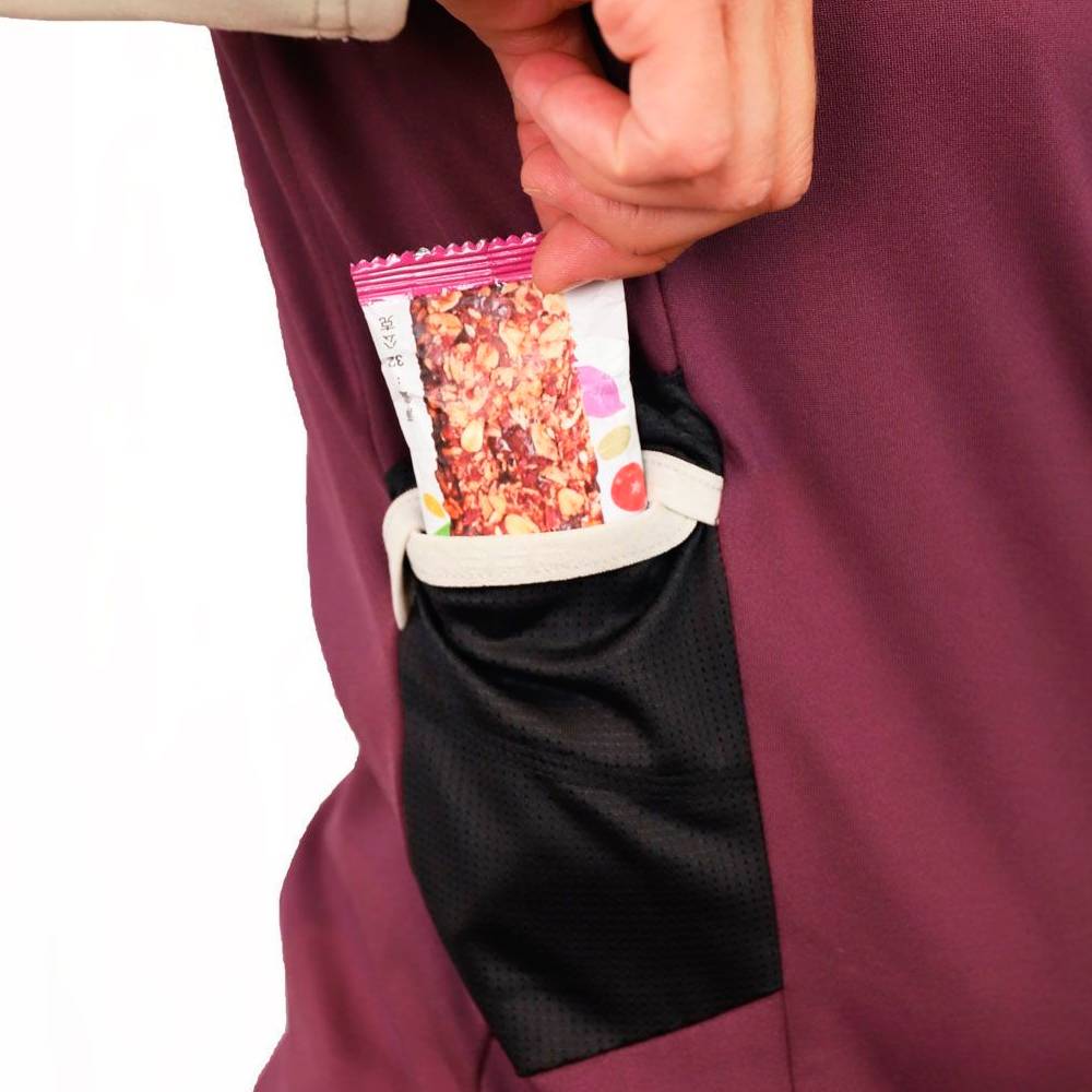 Cuenta con dos bolsillos laterales, para llevar llaves, gel, barritas, etc.