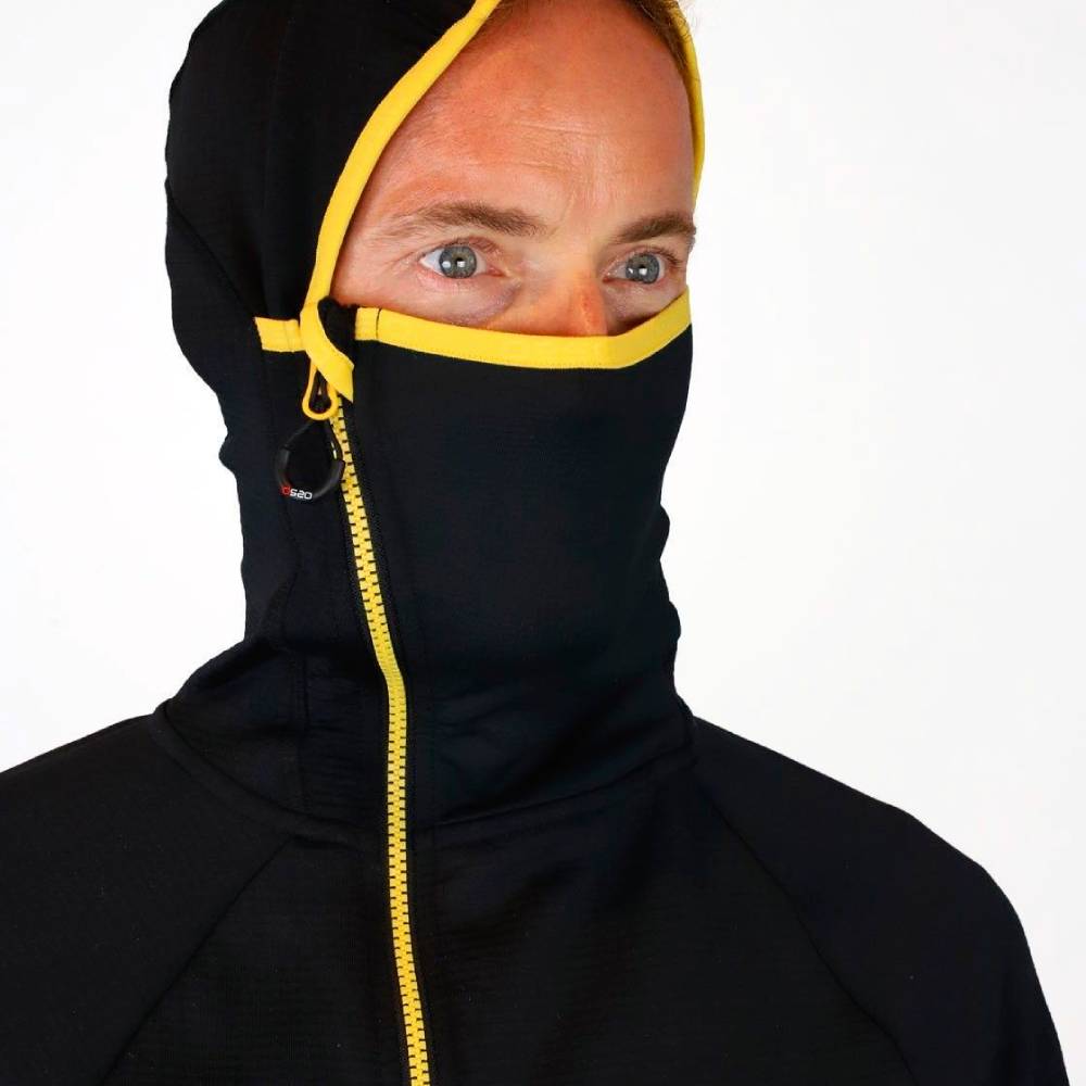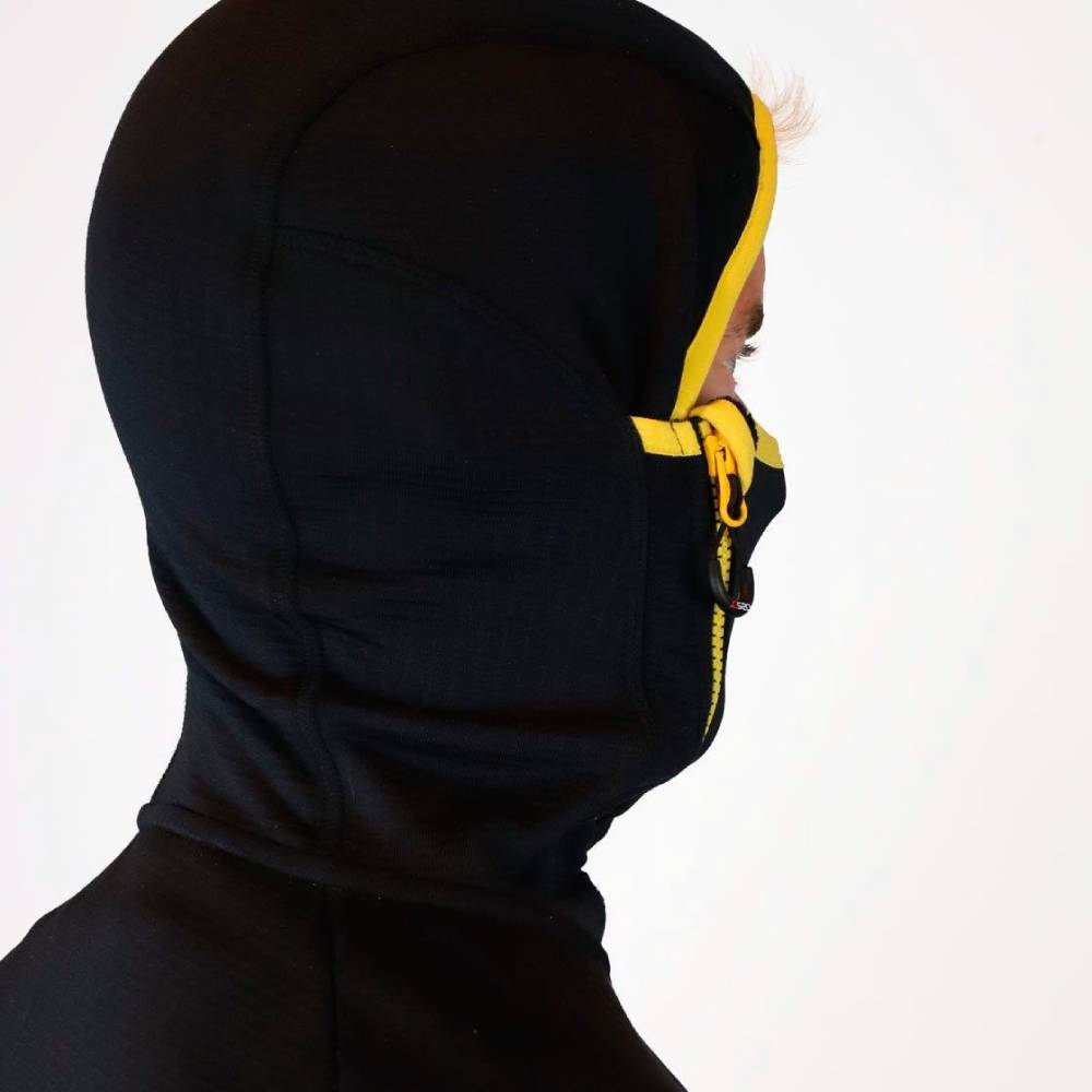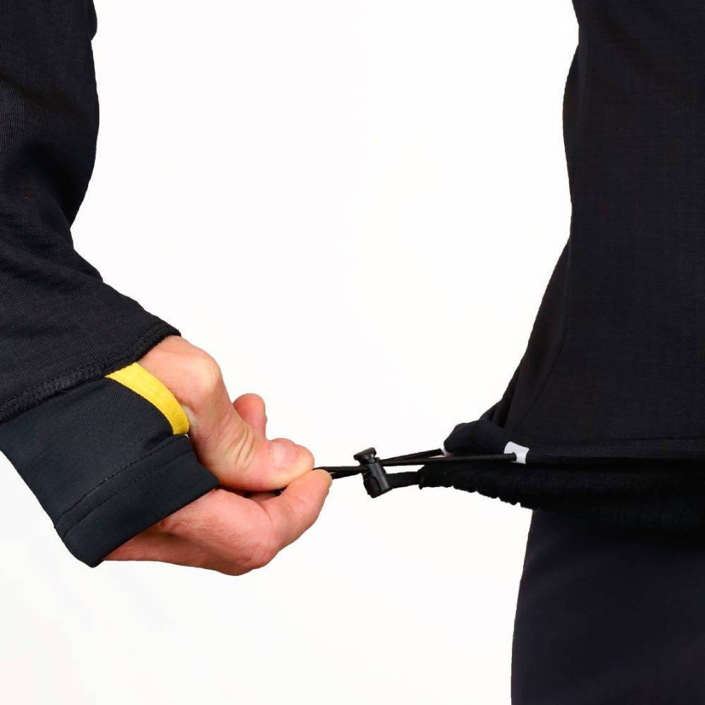 Su alta elasticidad hace que se ajuste al cuerpo a la perfección sin limitar los movimientos. La capucha ha sido milimétricamente diseñada, con un cuello que puede colocarse como máscara para proteger boca y nariz en las condiciones más extremas, y junto con su cremallera asimétrica que se cierra a un lado, evita molestias incluso tras muchas horas de uso. Los puños con agujero para el pulgar permite un ajuste perfecto para mantener protección y calor.