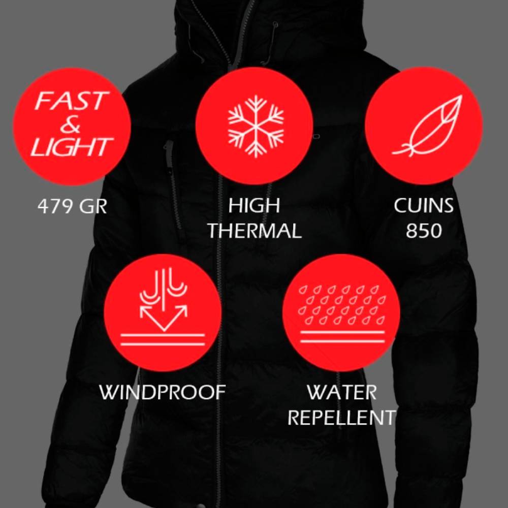 La tecnología DWR (Durable Water Repellency) refuerza aún más la capacidad de esta chaqueta para mantener a raya la humedad, garantizando un rendimiento óptimo en climas impredecibles. La elección del relleno de pluma de pato 90/10 de 850 CUINS demuestra un compromiso inquebrantable con la eficiencia térmica, proporcionando una calidez excepcional sin agregar peso innecesario.