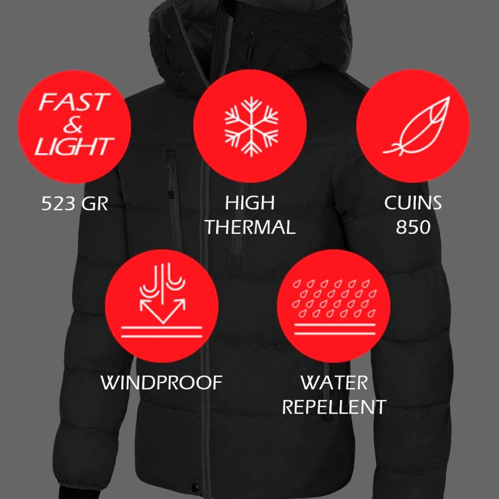 La tecnología DWR (Durable Water Repellency) refuerza aún más la capacidad de esta chaqueta para mantener a raya la humedad, garantizando un rendimiento óptimo en climas impredecibles. La elección del relleno de pluma de pato 90/10 de 850 CUINS demuestra un compromiso inquebrantable con la eficiencia térmica, proporcionando una calidez excepcional sin agregar peso innecesario.
