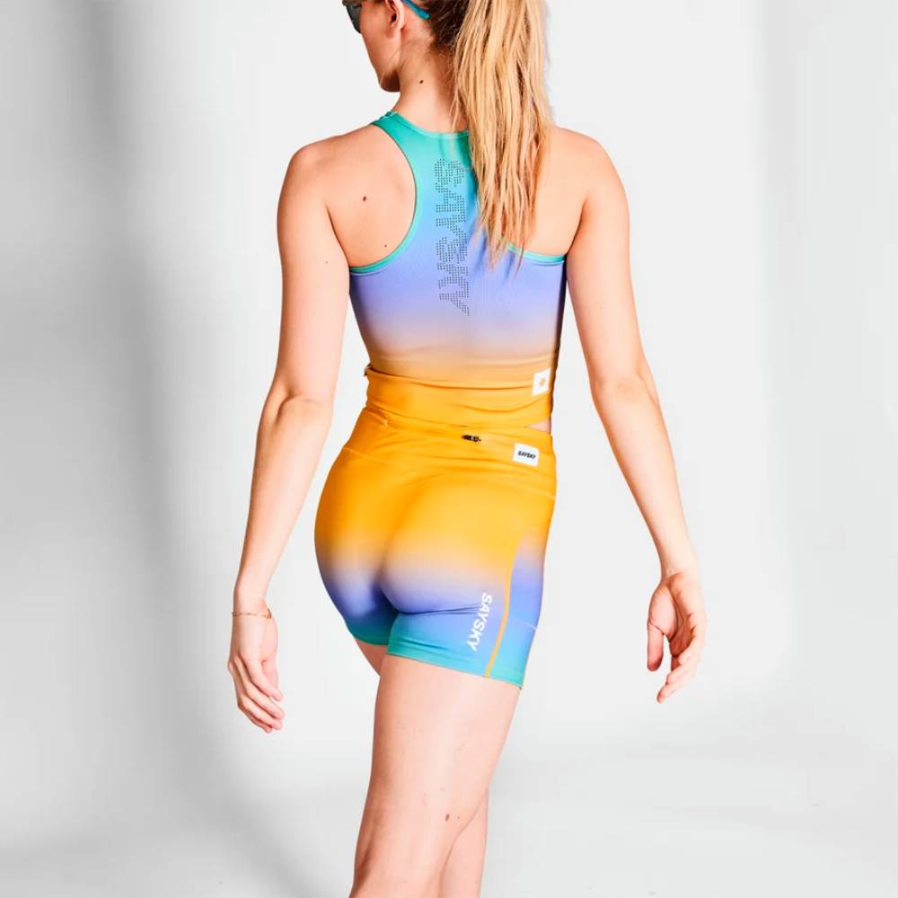 Con un peso de solo 110 gramos, ofrece un ajuste ceñido y está fabricado en un 80% de poliéster reciclado y un 20% de spandex. Incorpora el tejido técnico SAYSKYDRY, que destaca por su suavidad, ligereza y capacidad para evacuar la humedad, manteniéndote seca y cómoda durante todo el entrenamiento.