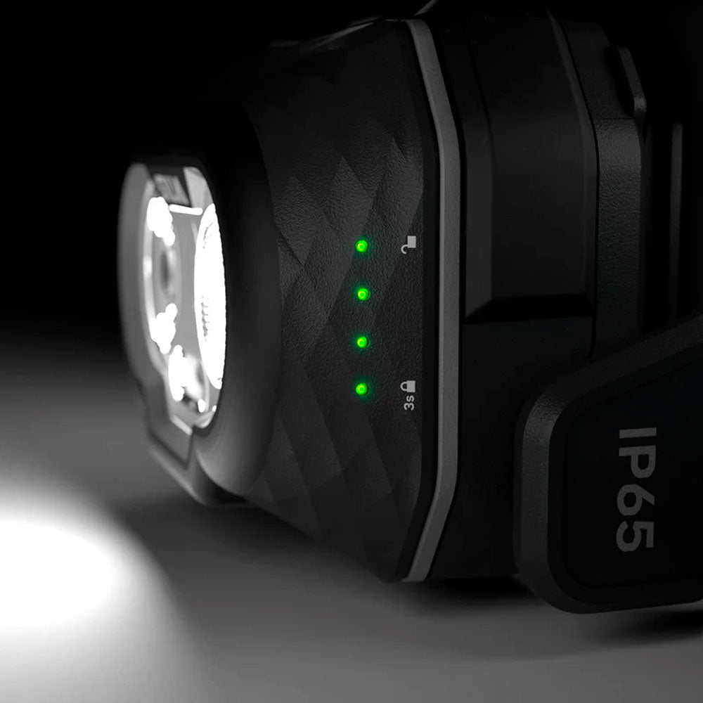 Discover es un frontal duradero, con un diseño resistente al polvo y al agua que cumple con la norma IP65. La cinta ancha para la cabeza ofrece un ajuste cómodo con hebillas suaves para facilitar la regulación.