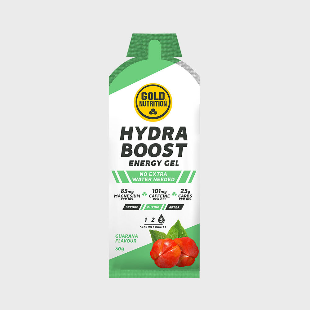 El gel energético Gold Nutrition Hydra Boost es un gel extra fluido con cafeína que aporta rápidamente 20g de hidratos de carbono de fácil digestión – maltodextrina y fructosa – permitiendo un rápido aporte de energía y un retraso de la fatiga.