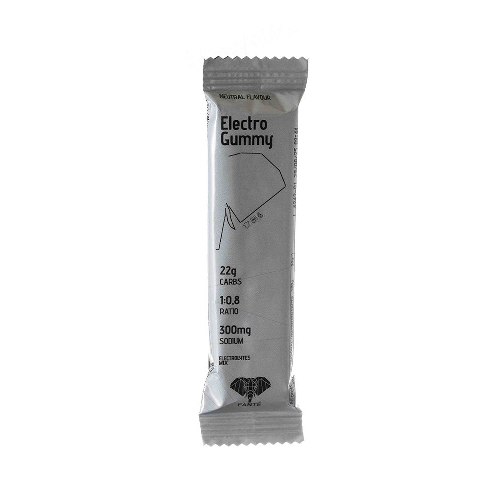 La gominola energética Fanté Electro Gummy es una barrita de electrolitos con 300mg de sodio y 22g de carbohidratos en relación 1:0,8 glucosa:fructosa. Sabor neutro, sin conservantes ni aromas según la actual evidencia científica.
