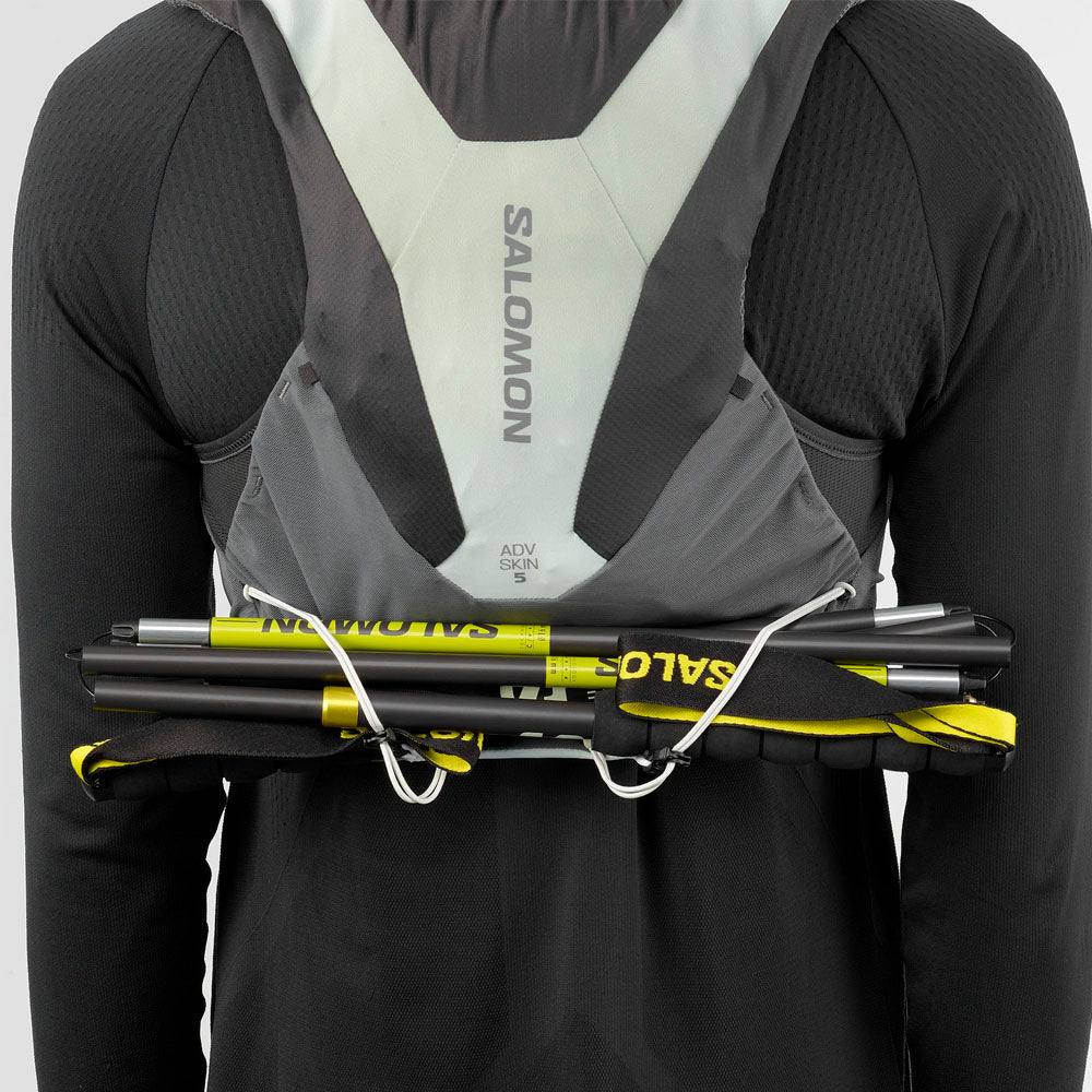 Estos bucles se pueden quitar fácilmente si prefieres llevar los bastones de otra forma, por ejemplo, con el Custom Quiver, el carcaj portabastones de Salomon, que es perfectamente compatible y que es un complemento cómodo a rabiar para llevar los palos. Se sujeta a la mochila mediante los ganchos superiores que hay en los hombros y los pequeños pasadores que hay en la parte inferior trasera.