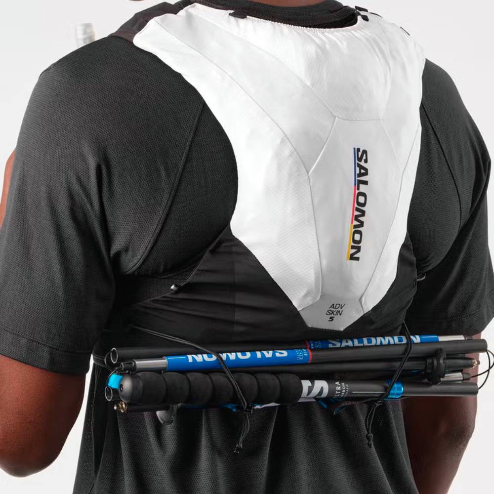 Estos bucles se pueden quitar fácilmente si prefieres llevar los bastones de otra forma, por ejemplo, con el Custom Quiver, el carcaj portabastones de Salomon, que es perfectamente compatible y que es un complemento cómodo a rabiar para llevar los palos. Se sujeta a la mochila mediante los ganchos superiores que hay en los hombros y los pequeños pasadores que hay en la parte inferior trasera.