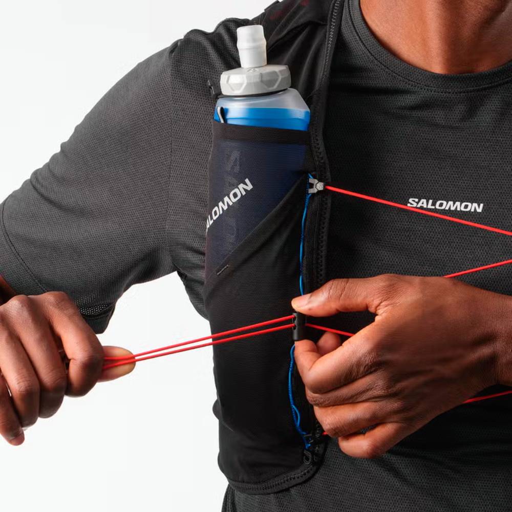 Empezando por los básicos, cuenta en la parte frontal con dos bolsillos para meter un par de soft flask de 500 ml —que vienen incluidos—. Los bidones entran y salen fácilmente, ajustan muy bien para evitar rebotes y se pueden sujetar con unas gomas pensadas para engancharlos alrededor de la tapa del y que no se muevan lo más mínimo.