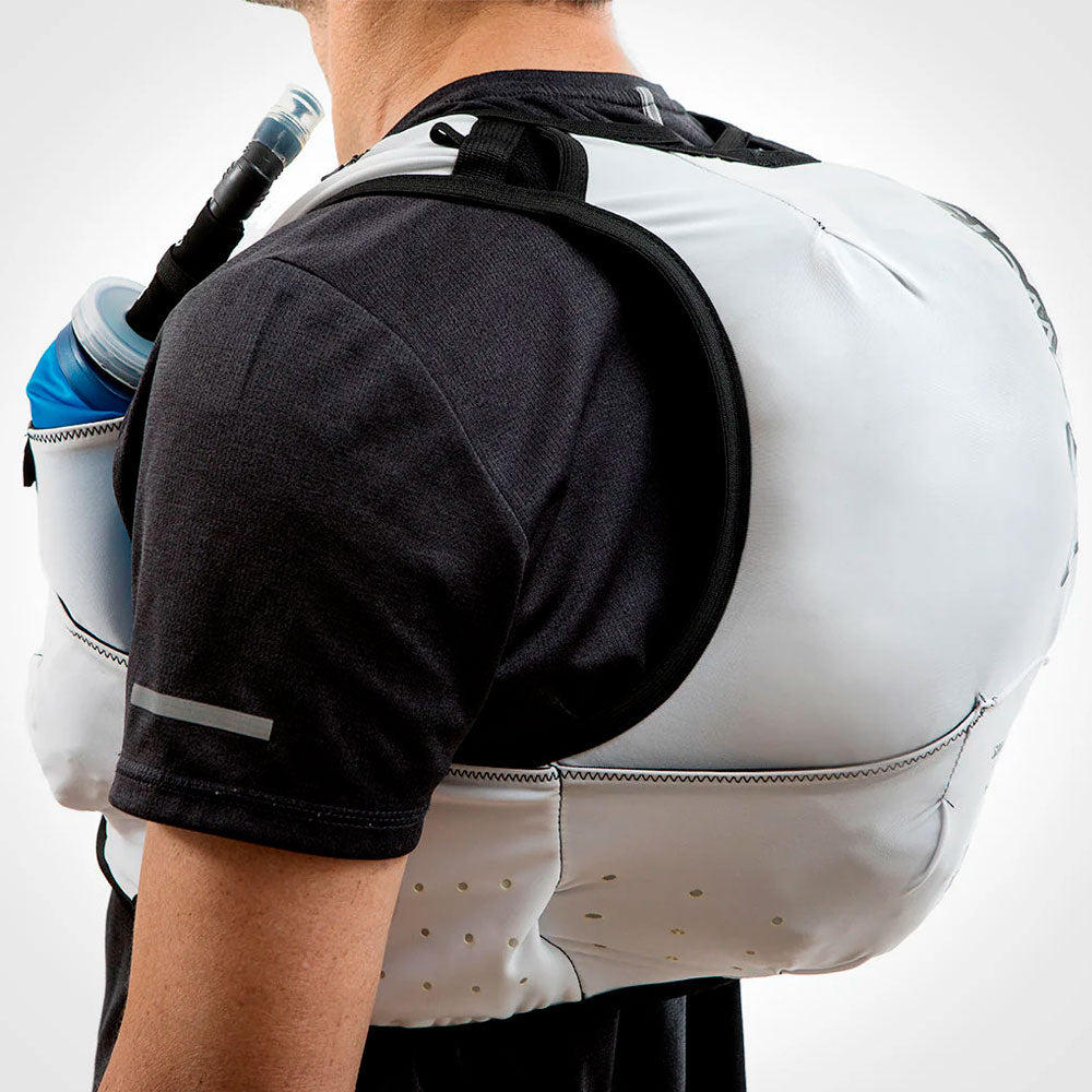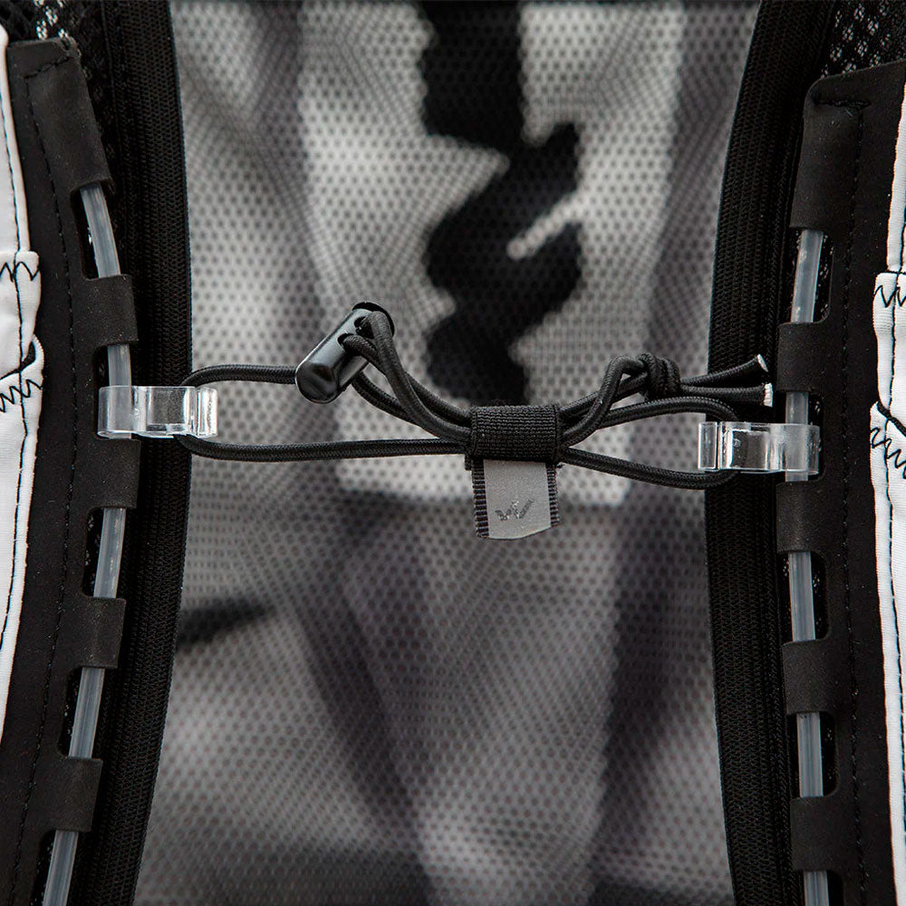 • 2 compartimentos frontales con enganches para botellas blandas tipo soft flask (recomendada) o botellas rígidas de hasta 750 ML.