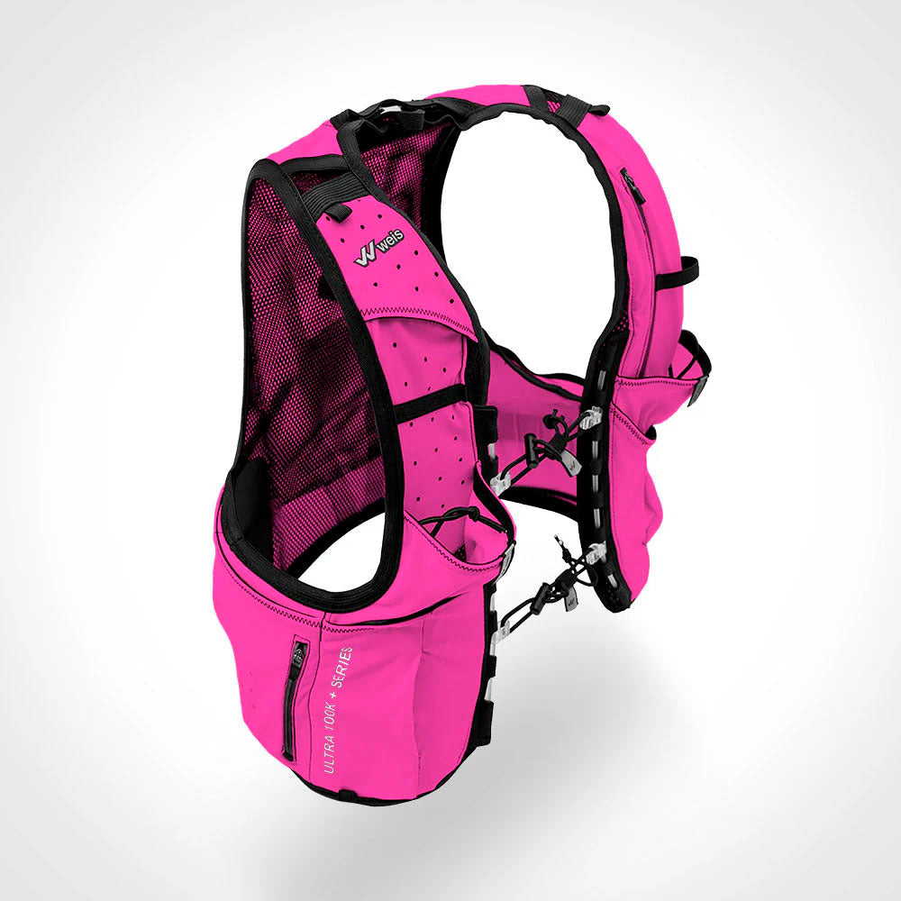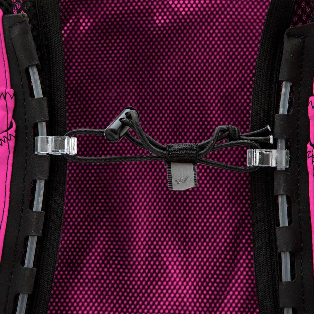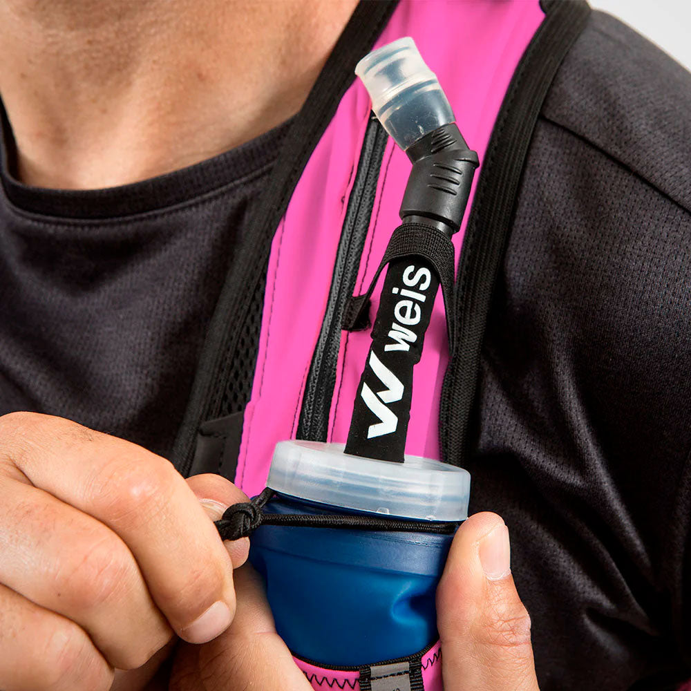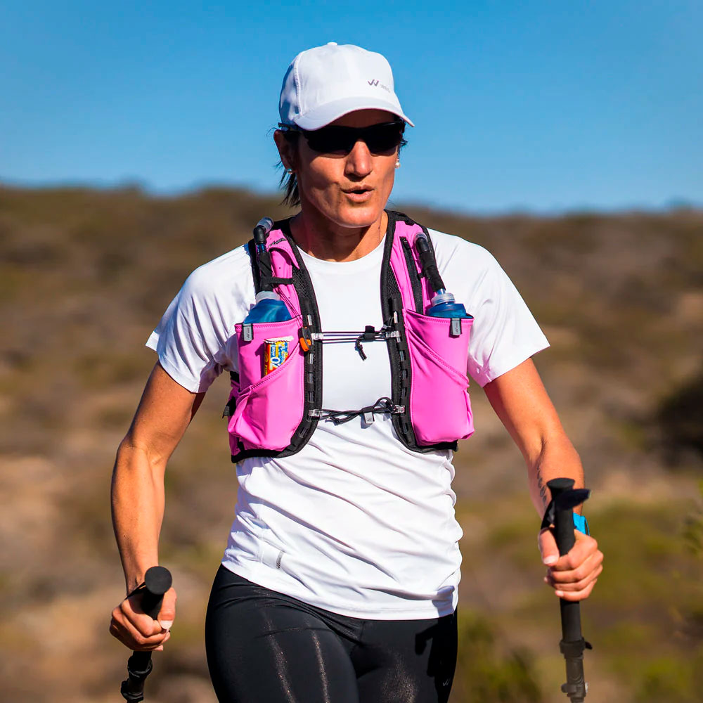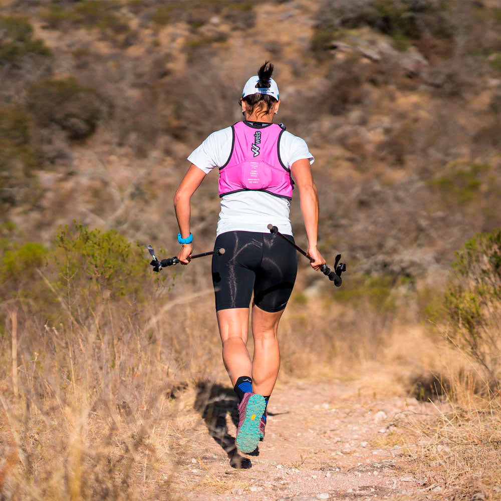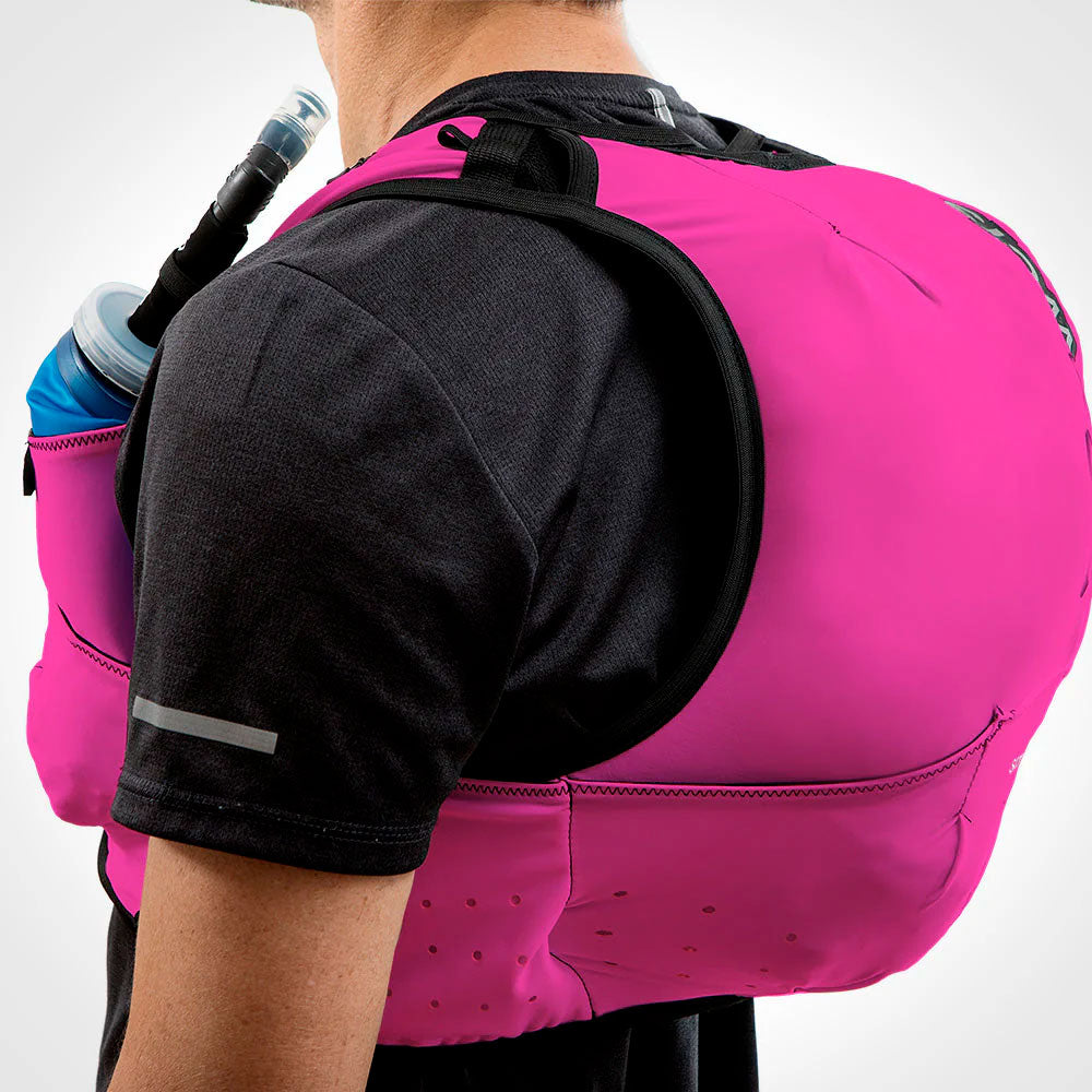 - 2 compartimentos frontales con enganches para botellas blandas tipo soft flask (recomendada) o botellas rígidas de hasta 750 ML.