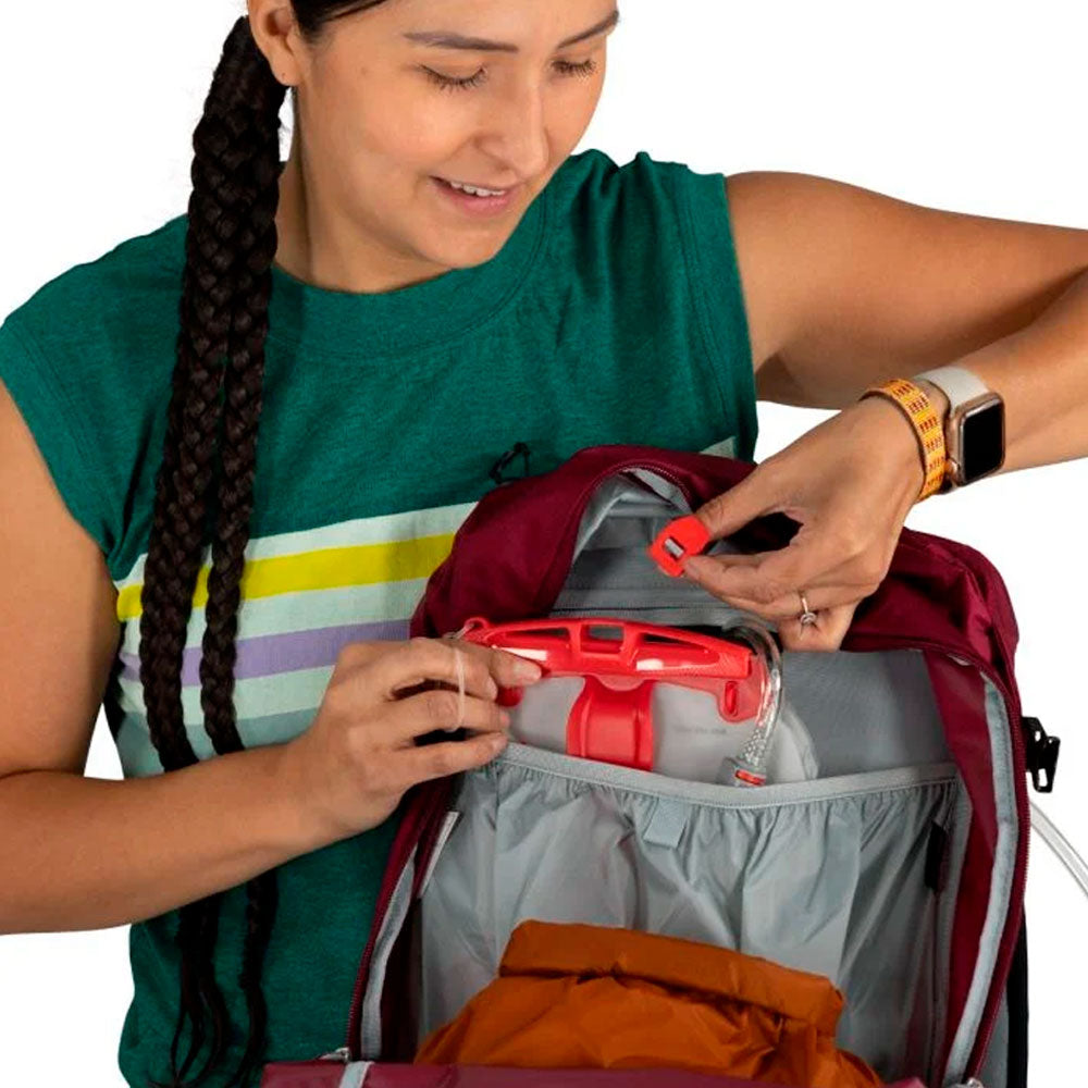 • Funda de depósito interna con puerto para manguera en el respaldo y Osprey Hydraclip para colgar fácilmente una bolsa de hidratación