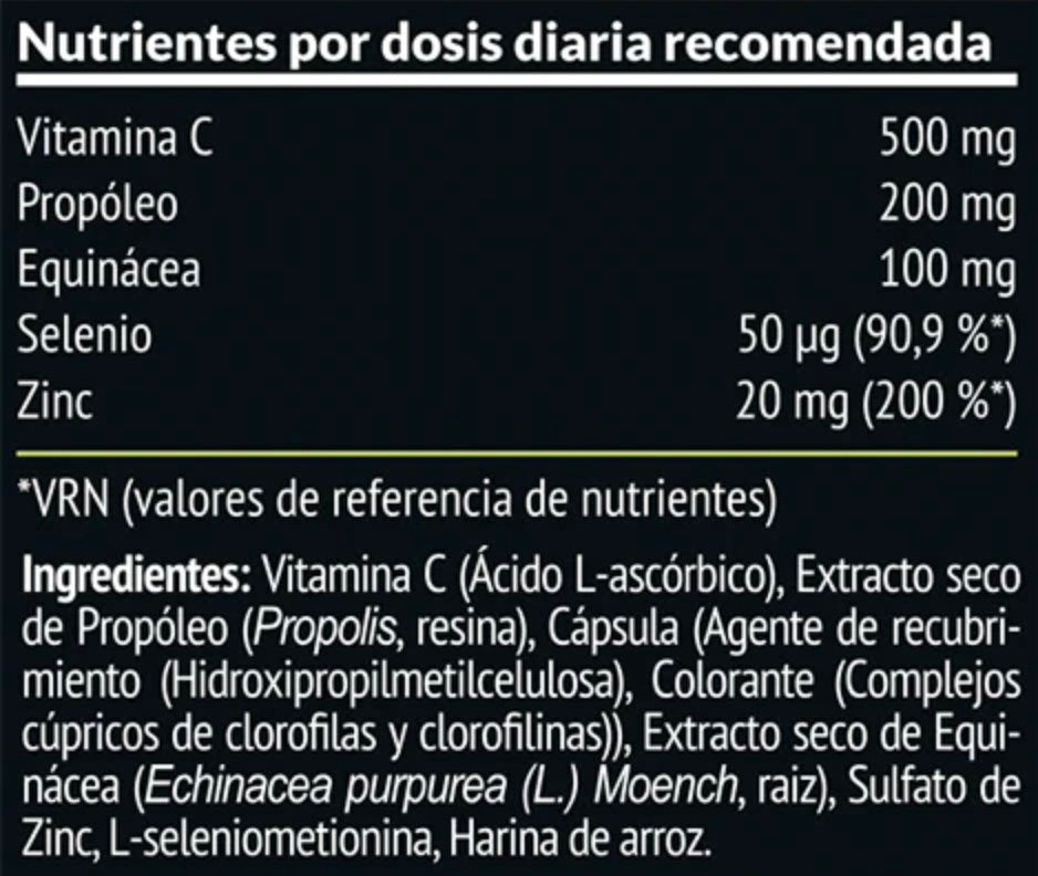 Ingredientes: Vitamina C (ácido L-ascórbico), extracto seco de propóleo (Propolis, resina), cápsula vegetal (hidroxipropilmetilcelulosa), extracto seco de Equinácea (Echinacea purpurea (L.) Moench, raíz), sulfato de zinc, L-seleniometionina, harina de arroz y colorante complejo cúprico de clorofilina (componente de la cápsula).