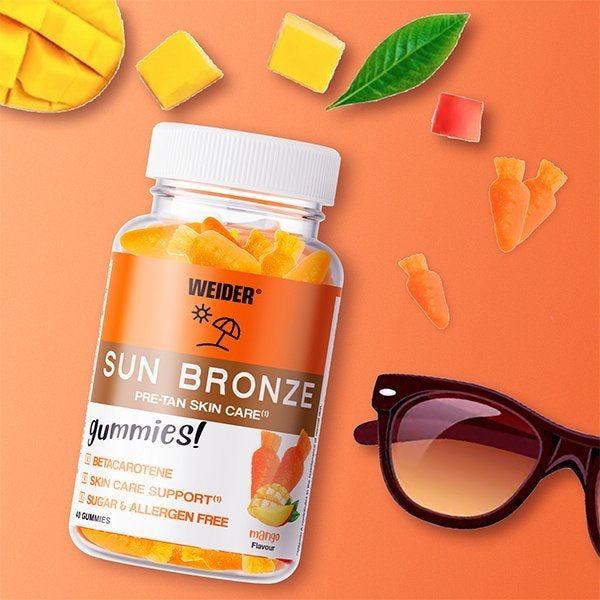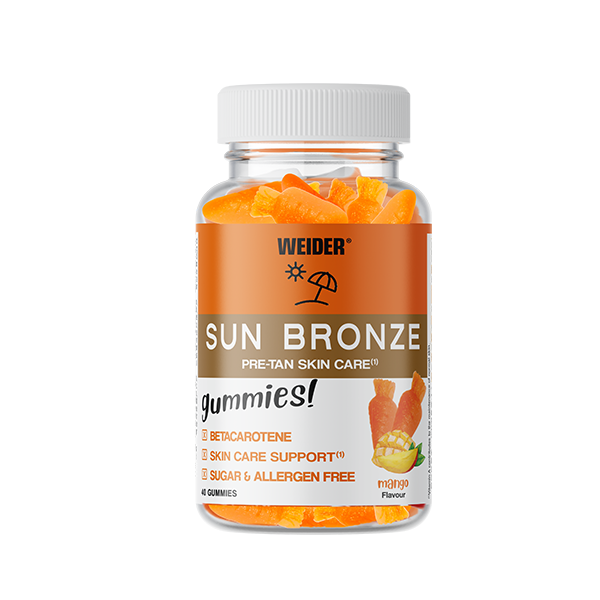 ¿Quieres mantener una piel cuidada y protegerla durante el bronceado? ¡Con nuestra nueva gummy WEIDER SUN BRONZE - GOMINOLAS PARA POTENCIAR EL BRONCEADO puedes conseguirlo! Sun Bronze está diseñada para ayudar al cuidado de tu piel gracias a su completa formulación a base de vitamina A, betacaroteno, luteína y zeaxantina. Estas sustancias, poseen numerosas funciones que harán que tu piel tenga un aspecto luminoso, cuidado y radiante. Además, ninguno de sus ingredientes tiene procedencia animal, por lo que es completamente apta para veganos y vegetarianos. Entre las principales propiedades de los ingredientes de Sun Bronze destacan: