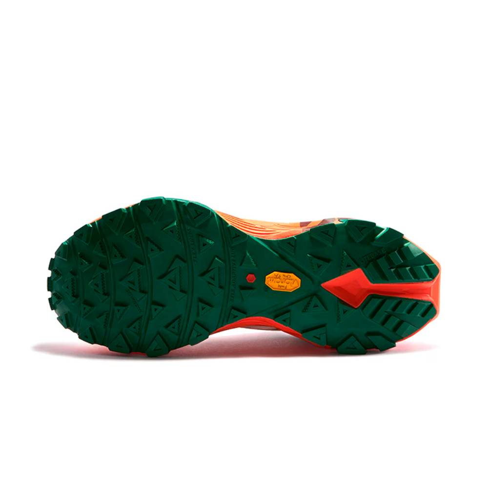 La suela está compuesta por Vibram Megagrip, uno de los compuestos más fiables en trail running. Con tacos de 4 mm, la disposición busca maximizar la tracción en la parte delantera y mejorar la retención en bajadas con el diseño trasero.