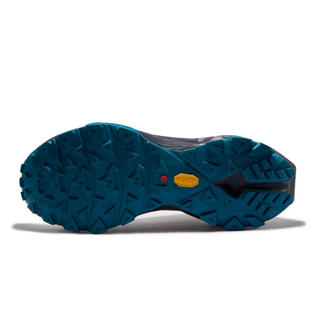 La suela está compuesta por Vibram Megagrip, uno de los compuestos más fiables en trail running. Con tacos de 4 mm, la disposición busca maximizar la tracción en la parte delantera y mejorar la retención en bajadas con el diseño trasero.