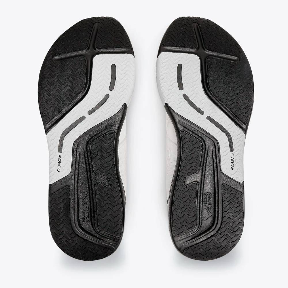 Todo ello se combina con la geometría GOFLOW, diseñada para mantener el pie alineado desde el talón hasta la puntera, favoreciendo una transición natural y fluida que reduce el desgaste muscular y mejora la eficiencia de carrera.