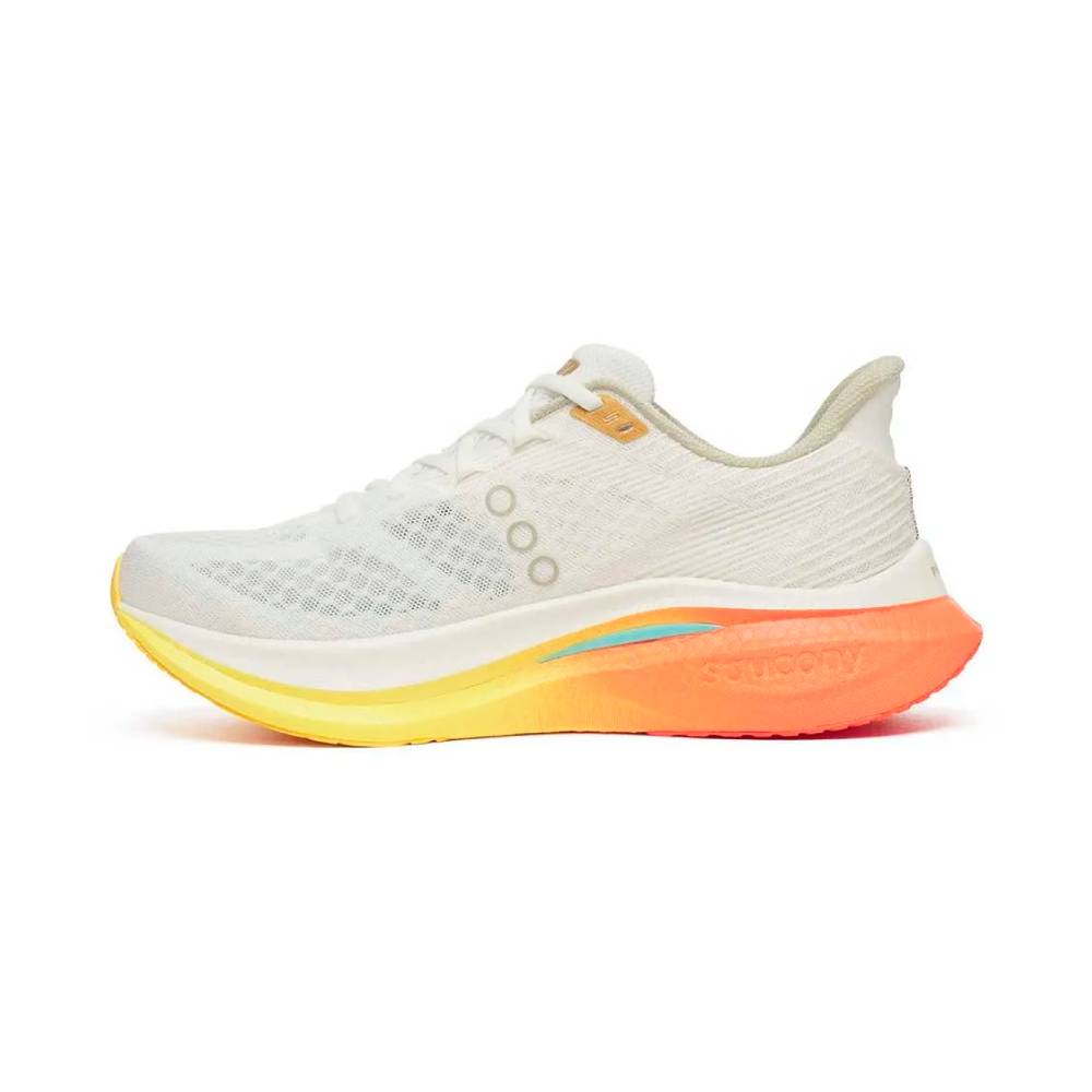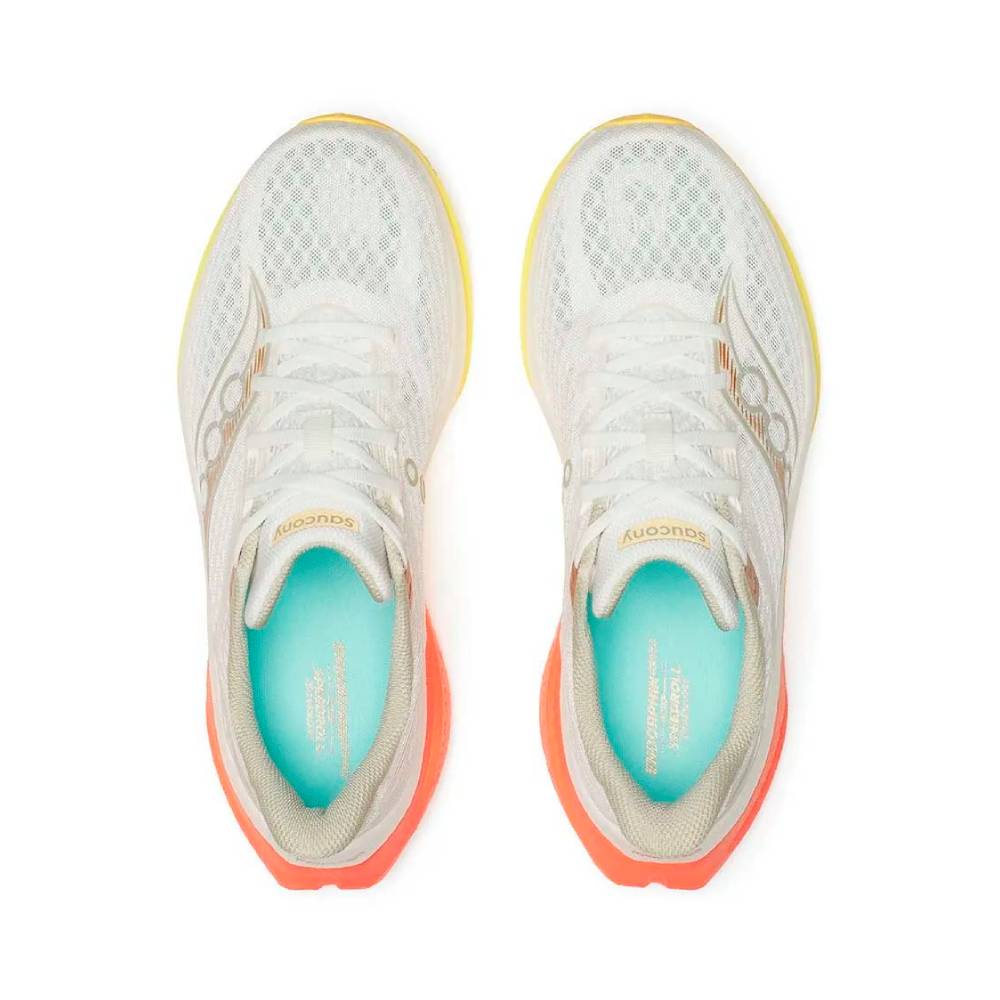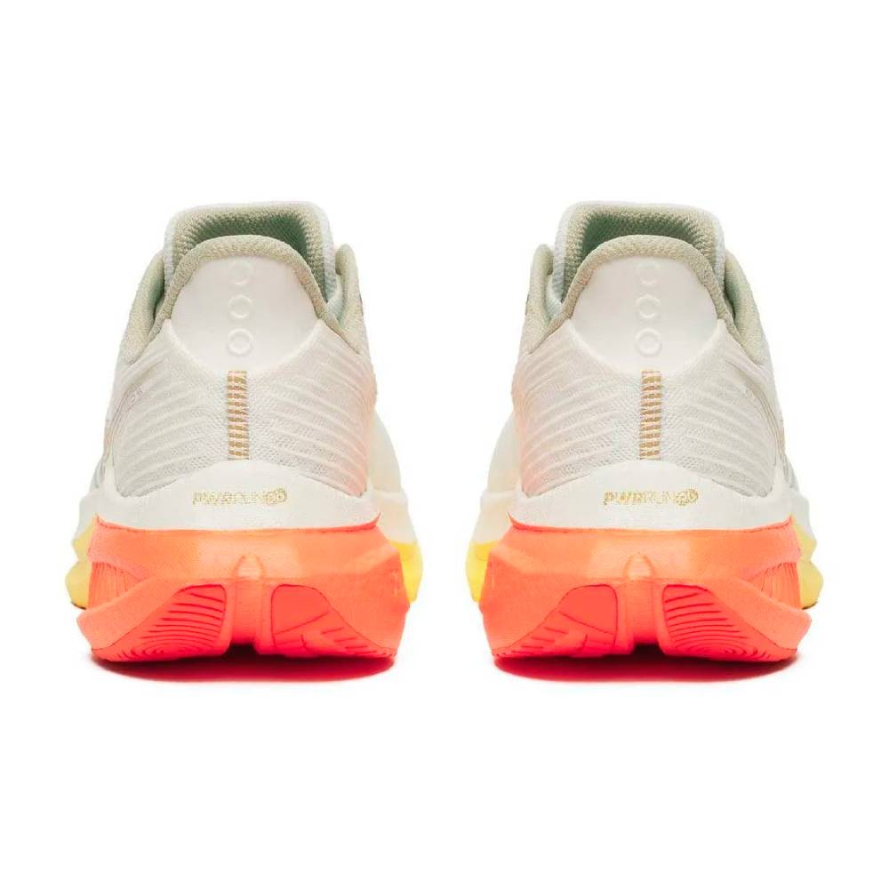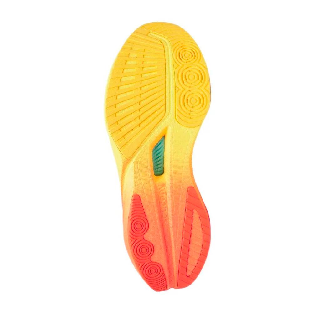 La mediasuela sigue confiando en el reconocido PWRRUN PB, uno de los compuestos más reactivos de Saucony. En esta versión, la espuma se ha optimizado mediante cortes y vaciados estratégicos a lo largo del chasis, permitiendo reducir el peso total del conjunto y mejorar la transición. En su interior encontramos la ya icónica placa de nylon, ligeramente ajustada en los laterales para ganar flexibilidad y adaptabilidad. El resultado es una pisada dinámica, estable y muy eficiente, que acompaña al corredor desde el impacto hasta el despegue con una respuesta progresiva y natural.