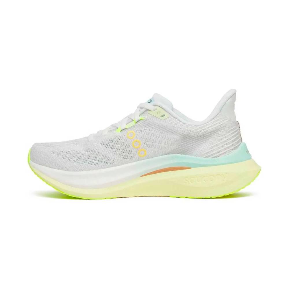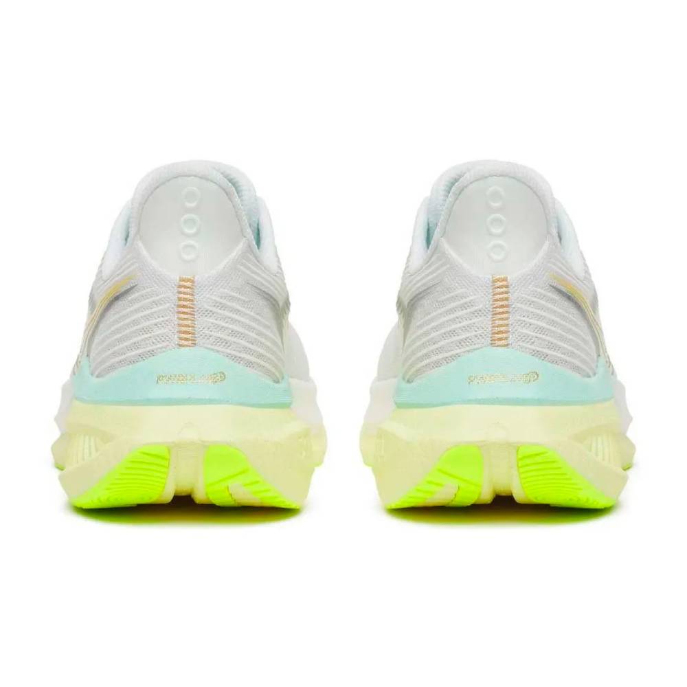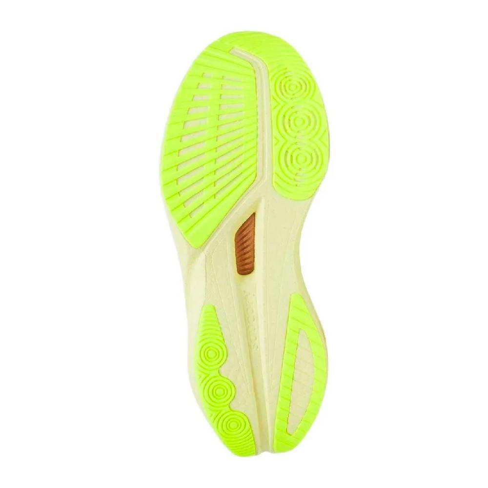 La mediasuela sigue confiando en el reconocido PWRRUN PB, uno de los compuestos más reactivos de Saucony. En esta versión, la espuma se ha optimizado mediante cortes y vaciados estratégicos a lo largo del chasis, permitiendo reducir el peso total del conjunto y mejorar la transición. En su interior encontramos la ya icónica placa de nylon, ligeramente ajustada en los laterales para ganar flexibilidad y adaptabilidad. El resultado es una pisada dinámica, estable y muy eficiente, que acompaña al corredor desde el impacto hasta el despegue con una respuesta progresiva y natural.