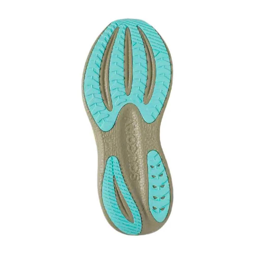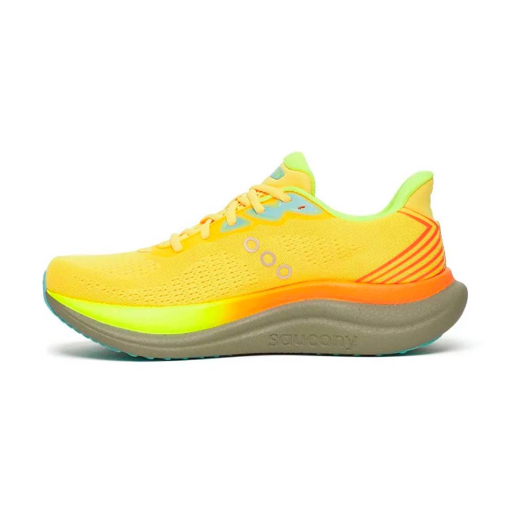 El corazón de la Triumph 23 sigue siendo el compuesto PWRRUN PB, presente en toda la mediasuela. En esta versión, Saucony ha conseguido aligerar y suavizar el material, manteniendo una amortiguación generosa pero con un tacto algo más amable y fluido que en versiones anteriores. La geometría de la mediasuela ha sido rediseñada, con líneas más limpias y modernas, aportando una transición más natural y una sensación de rodaje estable y confortable, ideal para acumular kilómetros sin fatiga excesiva.
