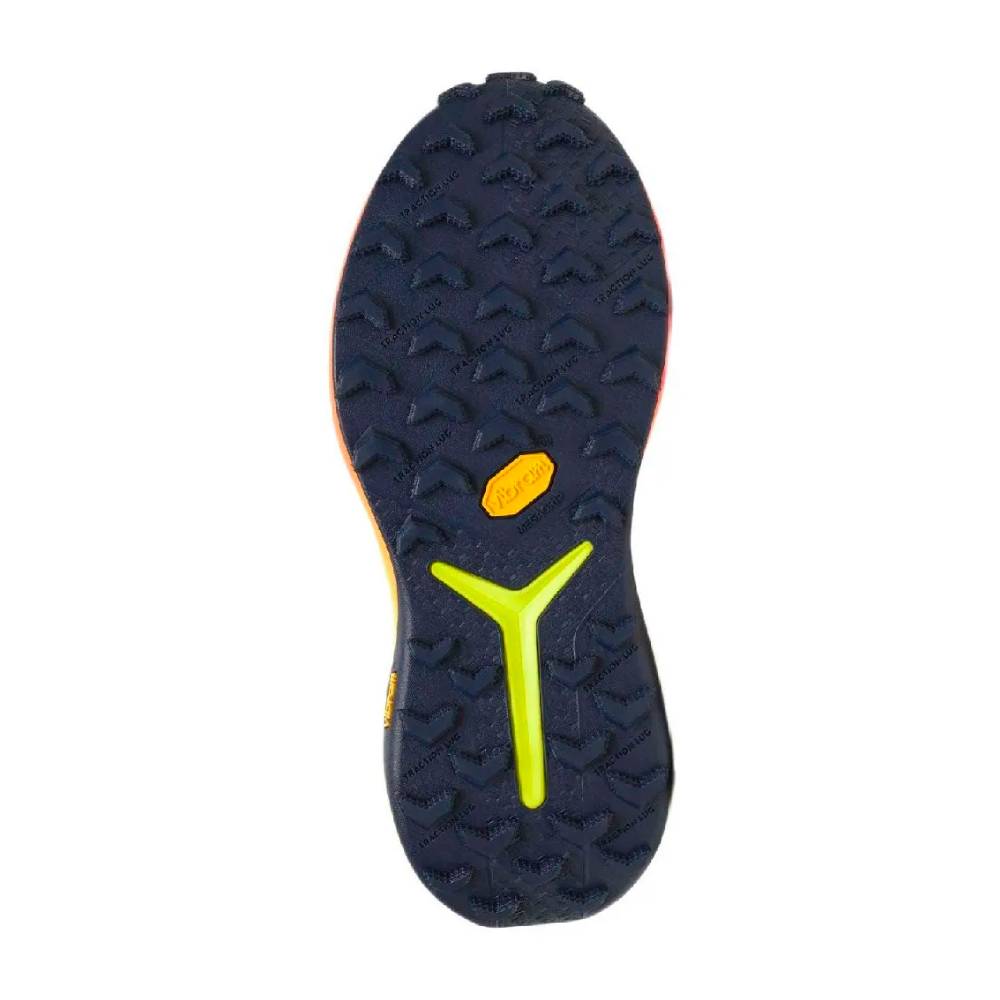 La gran novedad de esta versión es el regreso del Vibram® Megagrip, un compuesto de referencia en el trail running por su fiabilidad y durabilidad. La suela presenta tacos de 4 mm, de prominencia media y relativamente espaciados, lo que permite un excelente equilibrio entre agarre, polivalencia y evacuación del barro.